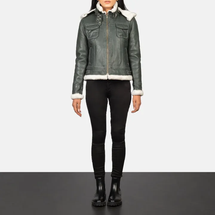 The Fiona Green Hooded Shearling Leather Jacket blends rich green leather with plush shearling lining, offering luxurious warmth, modern style, and exceptional winter comfort.
