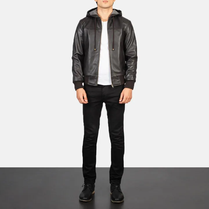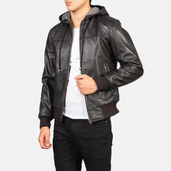 Nintenzo Brown Hooded Leather Bomber Jacket