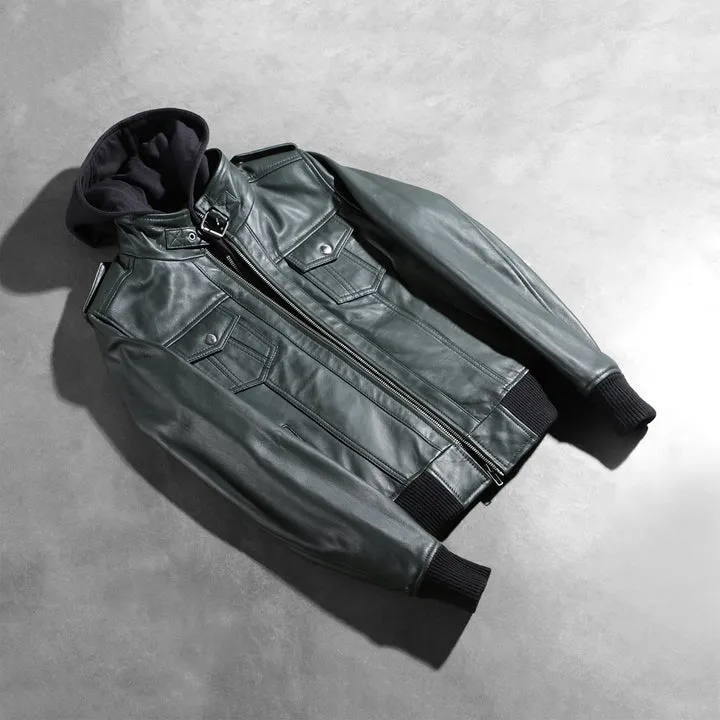 The Roslyn Green Hooded Leather Bomber Jacket features premium green leather, a modern hooded design, and a sleek bomber fit—perfect for stylish everyday wear and seasonal layering.
